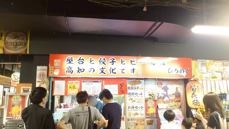 高知グルメが一堂に集結:カツオの藁焼き、うつぼの天ぷら、餃子、地酒など、地元の名物料理を一か所で楽しめます。